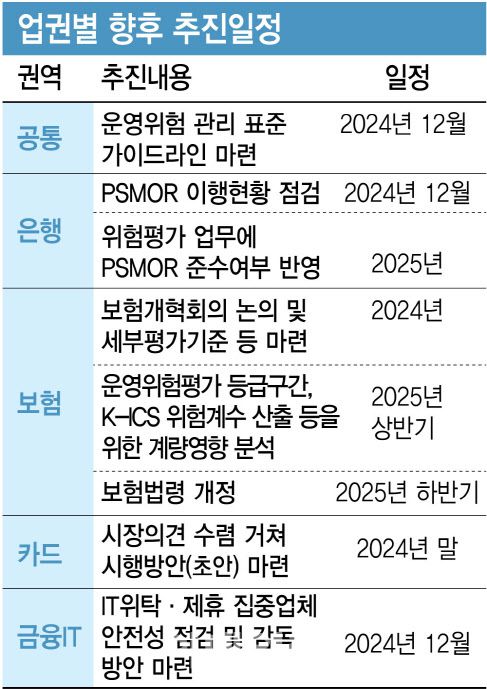 금융당국은 그동안 ‘동일기능-동일규제’ 원칙 적용에서 한 단계 높은 금융회사를 통한 간접관리에 나설 방침이다. 이는 현재 은행권에 시행하는 ‘운영위험 관리기준 개정안’(PSMOR)과 유사하다. 은행권은 올해 1월 PSMOR을 도입했다. 주요 내용 중 정보통신기술 도입에 따른 ICT 위협 관리체계 마련, 새로운 상품·서비스에 대한 운영위험 변경관리 정책 마련 등이 있다. 이에 따라 은행권은 운영위험가중자산(운영RWA)를 산출한다.