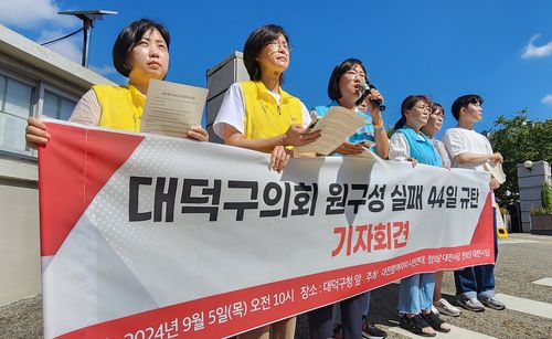 참여연대는 이날 대덕구의회 앞에서 기자회견을 열고 "대덕구의회가 후반기 의장단 원구성에 실패한 지 어느덧 44일이 흘렀다"며 "2년 전 전반기 원구성 실패를 경험한 구의회는 그 당시 잘못을 반복하고 있다"고 말했다.