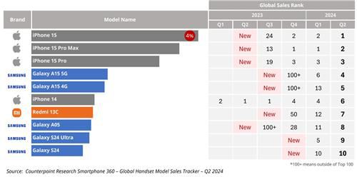 삼성 프리미엄 스마트폰 갤럭시 S24 울트라는 1분기 5위에서 신제품 출시 효과가 옅어지며 2분기에 9위로 떨어졌고, S24는 10위를 유지했다.