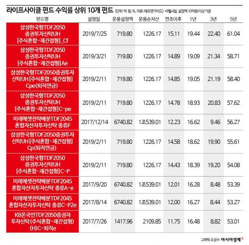6일 펀드평가사 에프앤가이드에 따르면 지난 4일 기준 국내 라이프사이클 유형 펀드 196개의 설정액은 10조5126억원으로 집계됐다. 연초 이후 1조4000억원 가까이 유입된 덕분이다. 순자산은 무려 15조1499억원으로 설정액의 1.4배가 넘는다. 주가 상승과 더불어 장기투자가 특징인 TDF 상품 특성상 복리 효과가 플러스알파로 반영된 덕분이다.