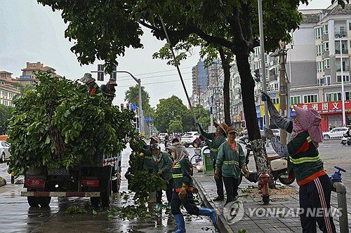 태풍 대비 가로수 정비하는 중국 하이난성 인부들 |