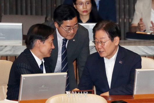 이재명 더불어민주당 전대표, 박찬대 당대표 직무대행, 조국 조국혁신당대표(오른쪽부터)가 지난달 1일 국회 본회의장에서 대화하고 있다. 박민규 선임기자 |