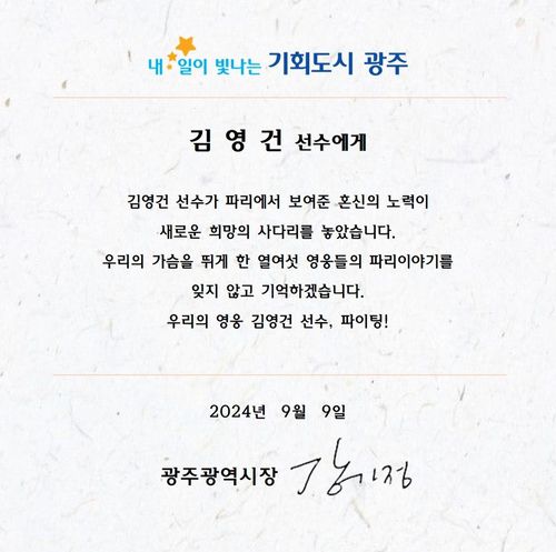 강 시장은 "파리에서 보여준 혼신의 노력이 새로운 희망의 사다리를 놓았다"며 "우리의 가슴을 뛰게 한 열여섯 영웅의 파리 이야기를 잊지 않고 기억하겠다"고 응원했다.
