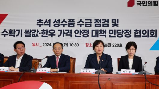 국민의힘은 10일 오전 추석 성수품 수급 점검 및 수확기 쌀값, 한우 가격 안정 대책 민당정 협의회를 열었다. 국민의힘에서 추경호 원내대표, 김상훈 정책위의장, 정희용 국회 농림축산해양수산식품부 간사, 정부에서 송미령 농림축산식품부 장관, 민간 측에서 이승호 한국농축산연합회 회장 등이 참석했다.