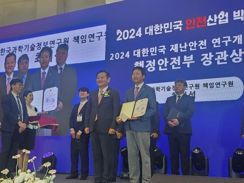 (대전=연합뉴스) 박주영 기자 = 한국과학기술정보연구원(KISTI)은 최기석 책임연구원의 '고성능 컴퓨팅(HPC) 활용 고정밀 침수모델 개발과 UDS 솔루션 현장 적용' 기술이 '2024 대한민국 재난안전 연구개발 대상'에서 행정안전부 장관상을 받았다고 10일 밝혔다.