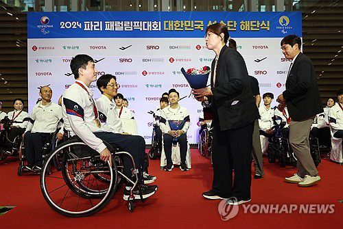 (영종도=연합뉴스) 김성민 기자 = 장미란 문화체육관광부 2차관이 10일 오후 인천국제공항 제2여객터미널에서 열린 2024 파리 패럴림픽 대한민국 선수단 해단식에서 선수 대표 김영건에게 꽃다발을 주고 있다. 2024.9.10