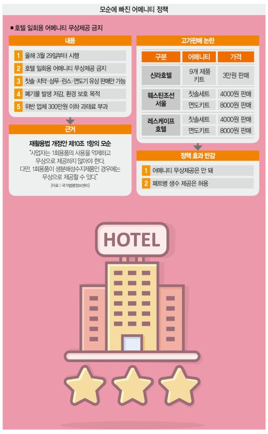 하지만 이 제도가 어떤 성과를 내고 있는지는 도통 알 수 없다. 고가 논란에 탁상정책이란 비판까지 곳곳에서 쏟아져서다. 무엇보다 호텔에서 판매하는 일회용품 가격이 지나치게 고가다.