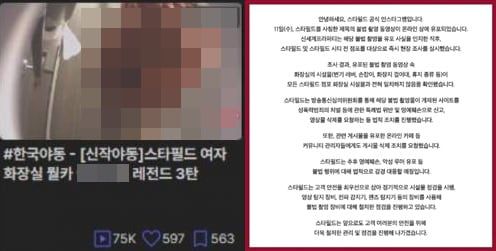 음란물 사이트에 '스타필드 여자화장실 몰카'라는 제목으로 올라온 불법촬영물(왼쪽), 신세계프라퍼티 입장문./온라인커뮤니티 |