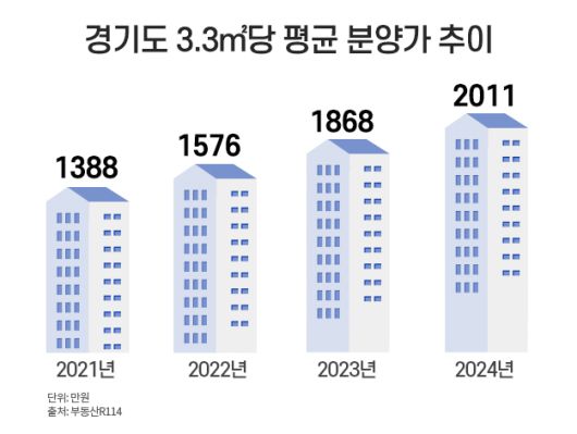 서울에 이어 경기도 아파트 분양가도 치솟고 있다. 올해 경기도에서 분양한 아파트의 평균 분양가는 처음으로 3.3㎡당 2000만원을 넘어섰다. 공사비와 인건비 상승으로 인한 분양가 인상은 앞으로도 계속될 전망이다.