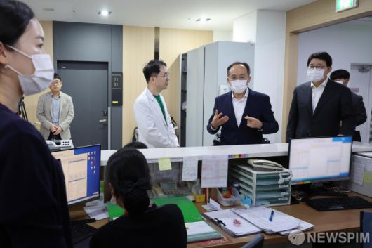 [서울=뉴스핌] 윤창빈 기자 = 추경호 국민의힘 원내대표가 12일 오전 추석명절 대비 응급진료체계 현장방문차 서울 동대문구 린 여성병원을 방문해 병동을 둘러보고 있다. 2024.09.12 pangbin@newspim.com