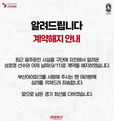 부산은 12일 구단 사회관계망서비스(SNS)를 통해 "음주 운전 사실을 구단에 자진해서 알려온 성호영과 11일 자로 계약을 해지했다"라며 "팬들에게 심려를 끼쳐 죄송하다"고 발표했다.