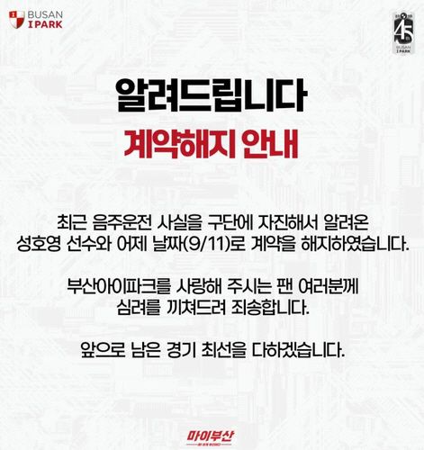 성호영과 계약 해지 알린 부산 구단. /부산 아이파크 |