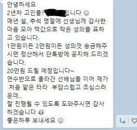 이 대화방에서 자신을 ‘2년차 고인물’이라고 소개한 A씨는 “매년 설, 추석 명절에 선생님께 감사한 마음을 모아 떡값으로 작은 성의를 표하고 있다”며 “1만원이든 2만원이든 성의껏 송금해 주시면 정산해서 단톡방에 공지해드리겠다. 20만원 드릴 예정”이라고 메시지를 남겼다. 고인물은 한 곳에 오래 있는 사람들을 뜻하는 말이다.