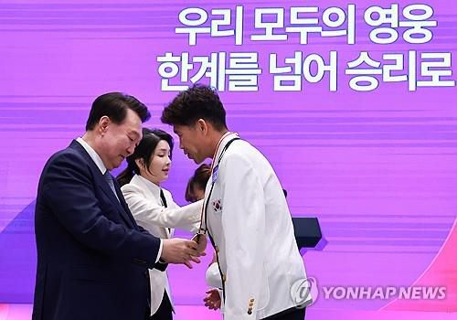 윤석열 대통령 부부, 파리 패럴림픽 김황태 선수 부부에게 국민감사 메달 수여 |