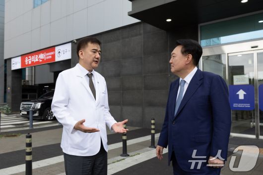 (서울=뉴스1) 송원영 기자 = 윤석열 대통령이 13일 서울 중랑구 서울의료원을 방문, 이현석 서울의료원장과 대화를 나누고 있다. (대통령실 제공) 2024.9.13/뉴스1sowon@news1.krCopyright ⓒ 뉴스1. All rights reserved. 무단 전재 및 재배포, AI학습 이용 금지.