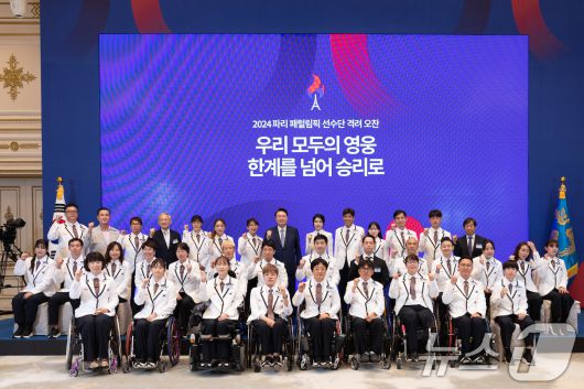 (서울=뉴스1) 송원영 기자 = 윤석열 대통령과 김건희 여사가 13일 청와대 영빈관에서 열린 '2024 파리 패럴림픽 선수단 격려 오찬'에서 선수단과 기념촬영을 하고 있다. (대통령실 제공)2024.9.13/뉴스1sowon@news1.krCopyright ⓒ 뉴스1. All rights reserved. 무단 전재 및 재배포, AI학습 이용 금지.