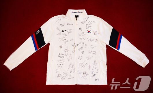(서울=뉴스1) 송원영 기자 = 윤석열 대통령과 김건희 여사는 13일 청와대 영빈관에서 열린 '2024 파리 패럴림픽 선수단 격려 오찬'에서 배동현 파리 패럴림픽 선수단장과 보치아 종목에 출전한 강선희 선수로부터 기념 선물을 받았다. 사진은 윤 대통령이 배 단장으로부터 받은 패럴림픽 10회 연속 금메달을 달성한 보치아 선수들의 사인이 담긴 선수복 선물. (대통령실 제공) 2024.9.13/뉴스1