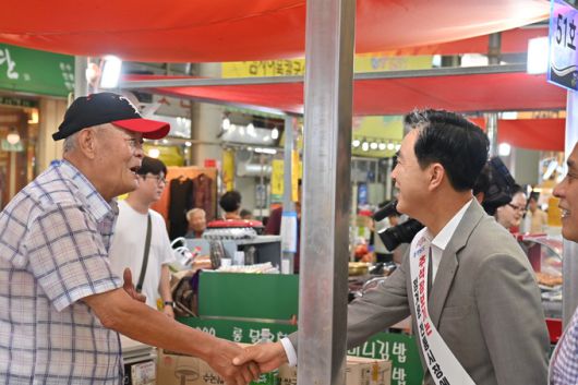 김태흠 충남지사가 지난 13일 추석명절을 앞두고 천안 중앙시장을 찾아 장보기를 하며 한 상인과 인사하고 있다. 김정모 기자 |