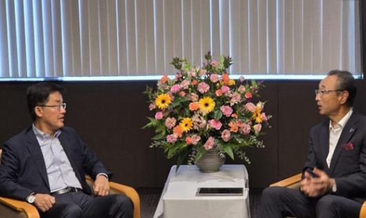 박철희(왼쪽) 주일 한국대사가 18일 와타나베 사도시장 면담했다. 〈사진=주일 한국대사관 제공·연합뉴스〉 |