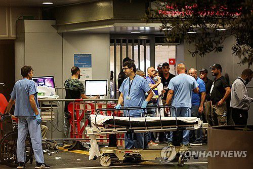 (베이루트 로이터=연합뉴스) 무선호출기 동시다발 폭발이 발생한 17일(현지시간) 레바논의 한 병원에 의료진들이 서 있다. 2024.9.17. photo@yna.co.kr |