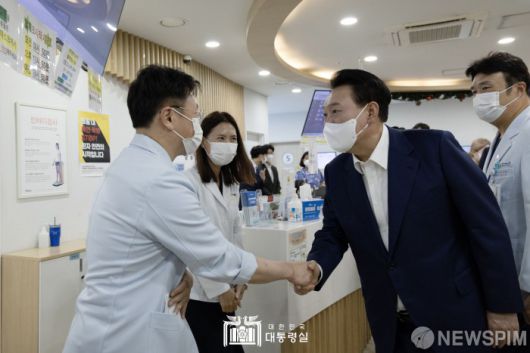[서울=뉴스핌] 윤석열 대통령이 18일 서울 성북구 우리아이들병원을 방문해 추석 연휴 기간 진료 유지에 차질이 없는지 현장을 살피고 묵묵히 의료현장을 지키는 의료진의 노고를 격려하고 있다. [사진=대통령실] 2024.09.18 photo@newspim.com