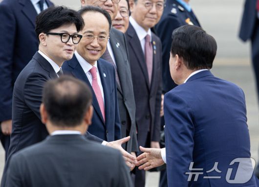 (성남=뉴스1) 이재명 기자 = 윤석열 대통령이 19일 오전 경기도 성남시 서울공항에서 체코로 출국하기 전 한동훈 국민의힘 대표와 인사하고 있다. 윤 대통령은 이번 체코 방문을 통해 지난 7월 한국수력원자력이 두코바니 신규 원전 건설사업의 우선협상대상자로 선정된 이후 후속 조치에 매진한다는 방침이다. 2024.9.19/뉴스1