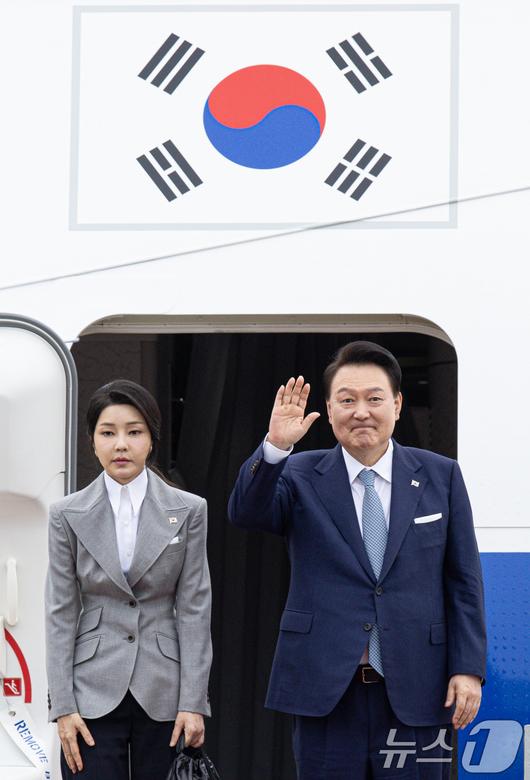 (성남=뉴스1) 이재명 기자 = 윤석열 대통령과 김건희 여사가 19일 오전 경기도 성남시 서울공항에서 체코로 출국하기 위해 공군 1호기에 올라 인사하고 있다. 윤 대통령은 이번 체코 방문을 통해 지난 7월 한국수력원자력이 두코바니 신규 원전 건설사업의 우선협상대상자로 선정된 이후 후속 조치에 매진한다는 방침이다. 2024.9.19/뉴스1