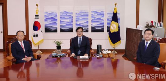 [서울=뉴스핌] 이형석 기자 = 우원식 국회의장(가운데)이 19일 오전 서울 여의도 국회에서 추경호 국민의힘(왼쪽)·박찬대 더불어민주당 원내대표와 회동을 하고 있다. 2024.09.19 leehs@newspim.com