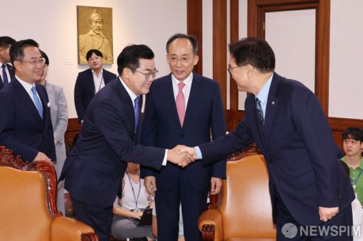 [서울=뉴스핌] 이형석 기자 = 우원식 국회의장(오른쪽)이 19일 오전 서울 여의도 국회에서 여야 원내대표 회동을 앞두고 박찬대 더불어민주당 원내대표와 악수를 하고 있다. 2024.09.19 leehs@newspim.com
