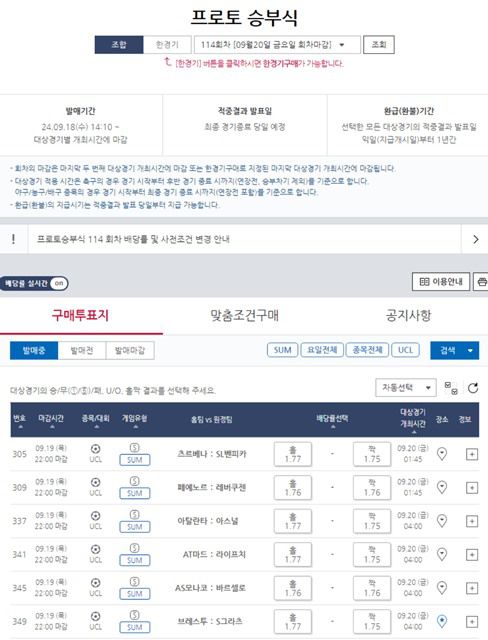 이번 프로토 승부식 114회차에서 UCL을 대상으로 하는 'SUM' 유형과 발매시간 변경 시행 등에 대한 자세한 사항은 스포츠토토 홈페이지 및 공식 인터넷 발매사이트 베트맨에서 확인할 수 있다.