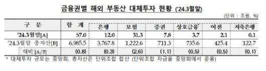 금융권의 해외 부동산 대체투자 잔액은 2024년 3월말 기준 57조원으로, 전분기 말 대비 6000억원 감소했다. 이는 금융권 총자산의 0.8% 수준이다.