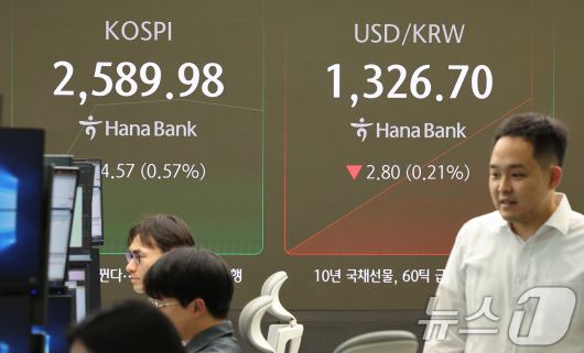 19일 오전 서울 중구 하나은행 본점 딜링룸 전광판에 코스피와 원·달러 환율 개장 시황이 표시되고 있다. 이날 9시5분 기준 코스피는 전거래일 대비 11.22p(0.44%) 상승한 2586.63, 코스닥은 전날 대비 6.73p(0.92%) 상승한 739.93를 가리키고 있다. 원·달러 환율은 전거래일 대비 0.5원 내린 1329.0원에 출발했다. 2024.9.19/뉴스1 ⓒ News1 장수영 기자 |