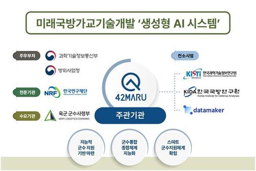 (서울=연합뉴스) 최현석 기자 = 생성형 인공지능(AI) 스타트업 포티투마루(42Maru)는 과학기술정보통신부·방위사업청 주관 '2024 미래국방가교기술개발사업'의 하나인 '핵심 무기체계 가동률 향상을 위한 국방기술정보 생성형 AI 시스템' 개발 사업의 주관기관으로 선정됐다고 20일 밝혔다.