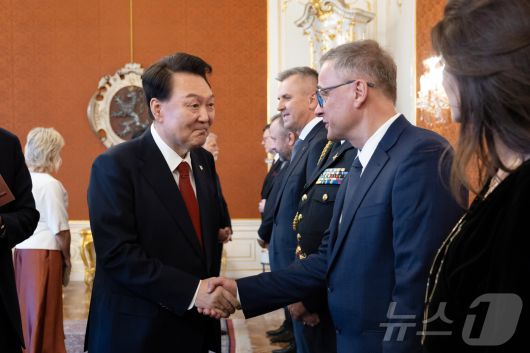 (서울=뉴스1) 송원영 기자 = 윤석열 대통령이 19일(현지시간) 체코 프라하성에서 열린 공식환영식에서 체코측 수행원들과 인사하고 있다. (대통령실 제공) 2024.9.20/뉴스1sowon@news1.krCopyright ⓒ 뉴스1. All rights reserved. 무단 전재 및 재배포, AI학습 이용 금지.