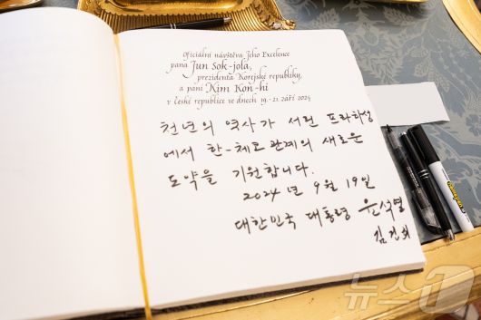 (서울=뉴스1) 송원영 기자 = 윤석열 대통령과 부인 김건희 여사가 19일(현지시간) 체코 프라하성 대통령궁을 방문, 방명록에 '천년의 역사가 서린 프라하성에서 한-체코 관계의 새로운 도약을 기원합니다'라는 글을 남겼다. (대통령실 제공) 2024.9.20/뉴스1