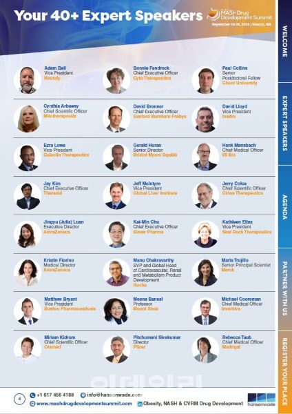 MASH 서밋은 MASH 치료제 개발을 논의하기 위해 2017년부터 매년 개최되는 국제 콘퍼런스로 올해 8회차를 맞는다. 이번 행사는 오는 24일부터 26일까지 미국 매사추세츠 보스턴에서 열리며 브리스톨 마이어스 스큅(BMS), 아스트라제네카, 로슈, 화이자, 마드리갈 등 다국적 제약사와 바이오 기업에서 MASH 신약 개발 전문가 40명 이상이 연사로 참여한다.