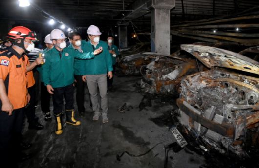 유정복 인천광역시장이 5일 서구 청라동 아파트 지하주차장 화재 현장을 다시 찾아 피해 및 복구 상황을 재점검하고 있다. [사진=인천시] |