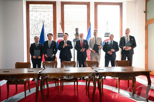 (서울=뉴스1) 송원영 기자 = 윤석열 대통령과 페트르 피알라 체코 총리가 20일(현지시간) 프라하 체코 정부청사에서 열린 한·체코 국책금융기관 간 5자 금융협력 MOU 체결식에서 윤희성 수출입은행장(왼쪽), 장영진 무역보험공사 사장(왼쪽 두번째)과 체코 국영개발은행, 수출은행, 수출보증보험공사 대표자들이 협약을 체결하자 박수치고 있다. (대통령실 제공) 2024.9.21/뉴스1