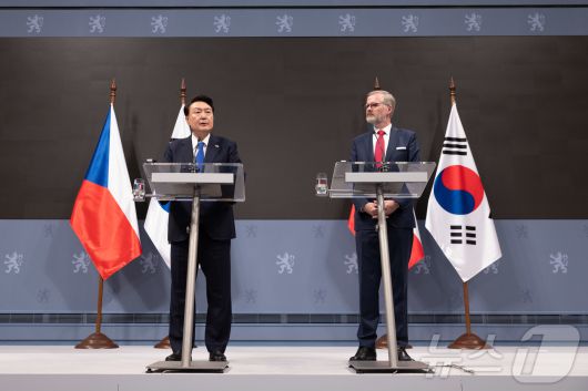 (서울=뉴스1) 송원영 기자 = 윤석열 대통령이 20일(현지시간) 프라하 체코 정부청사에서 페트르 피알라 체코 총리와 한·체코 공동언론발표를 하고 있다. (대통령실 제공) 2024.9.21/뉴스1sowon@news1.krCopyright ⓒ 뉴스1. All rights reserved. 무단 전재 및 재배포, AI학습 이용 금지.