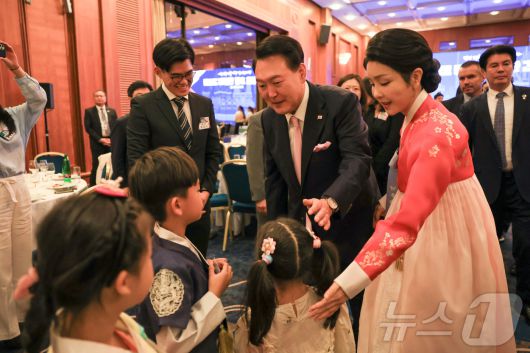(서울=뉴스1) 송원영 기자 = 윤석열 대통령과 김건희 여사가 20일(현지시간) 프라하 시내 한 호텔에서 열린 체코 동포 만찬 간담회에서 화동과 이야기를 나누고 있다. (대통령실 제공) 2024.9.21/뉴스1sowon@news1.krCopyright ⓒ 뉴스1. All rights reserved. 무단 전재 및 재배포, AI학습 이용 금지.