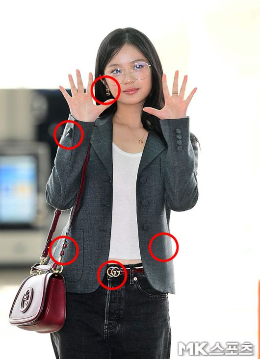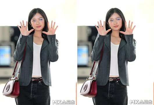 이날 출국길에서 금테 안경으로 포인트를 준 하니는 화이트 탱크탑위에 그레이 컬러의 자켓을 매치했고, 블랙의 캐주얼 팬츠로 공항패션을 완성했습니다.