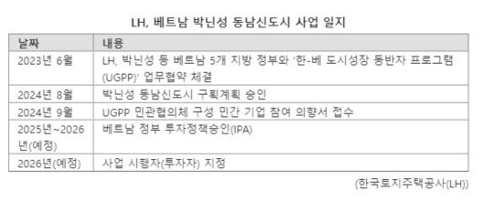 지난해 6월 윤석열 대통령의 베트남 방문 당시 LH가 박닌성 등 베트남 5개 지방 정부와 체결한 'UGPP' 업무협약(MOU)에 따라 추진하는 1호 사업으로 수주에 성공하면 '한국형 도시 수출'의 첫 사례가 된다.