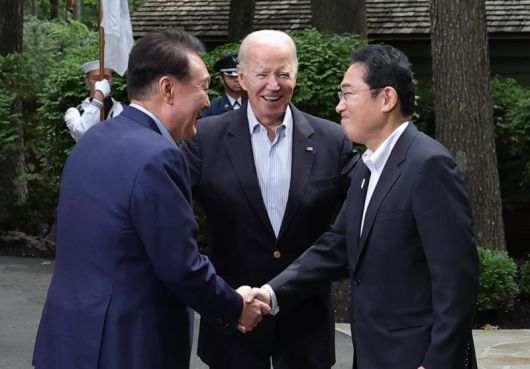 지난해 8월 18일(현지시간) 윤석열 대통령이 메릴랜드주에 위치한 미국 대통령 별장 캠프 데이비드에서 한미일 정상회의에 앞서 조 바이든 미국 대통령, 기시다 후미오 일본 총리와 만나 대화를 나누고 있는 모습. 사진=대통령실 |
