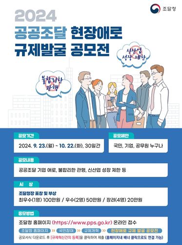 (대전=연합뉴스) 이은파 기자 = 조달청은 국민과 기업의 눈높이에서 규제개선 과제를 발굴하고 해소하기 위해 23일부터 다음 달 22일까지 '공공조달 현장 애로 규제발굴 공모전'을 개최한다고 밝혔다.