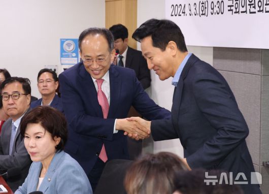 [서울=뉴시스] 고승민 기자 = 추경호 국민의힘 원내대표와 오세훈 서울시장이 지난 3일 서울 여의도 국회 의원회관에서 열린 딥페이크 디지털 성범죄 예방과 대응책 마련을 위한 정책토론회에서 인사를 하고 있다. 2024.09.03. kkssmm99@newsis.com |