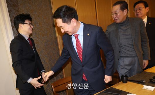 지난 1월 한동훈 당시 국민의힘 비상대책위원장(왼쪽)이 여의도 한 식당에서 4선 이상 의원들과 오찬을 갖기에 앞서 김기현 전 대표와 인사하고 있다. 김 전 대표의 오른쪽은 권영세 의원. 사진공동취재단 |