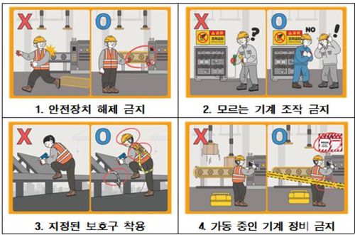 노동부와 안전보건공단은 아울러 외국인 근로자와 소규모 사업장의 안전문화 확산을 위해 ▲ 안전장치 해제 금지 ▲ 모르는 기계 조작 금지 ▲ 보호구 없이 작업 금지 ▲ 작동 중인 기계 정비 금지 등의 4대 금지 캠페인을 펼칠 예정이다.