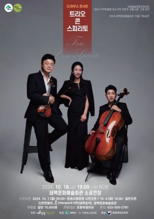 강원특별자치도 태백시(시장 이상호)는 오는 10월 18일 오후 7시에 태백문화예술회관 소공연장에서 태백문화예술회관 10월 기획공연으로 더 하우스 콘서트 3탄 ‘트리오 콘 스피리토’를 개최한다.