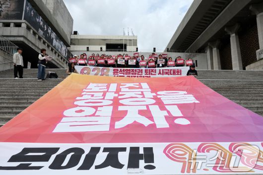 (서울=뉴스1) 이동해 기자 = 25일 오전 서울 광화문 세종문화회관 계단에서 열린 9.28 윤석열 정권 퇴진시국대회 선포 기자회견에서 참석자들이 구호를 외치고 있다. 이날 윤석열정권퇴진운동본부, 전국민중행동, 자주통일평화연대, 전국비상시국회의는 오는 28일 전국 각지에서 윤석열 정권 퇴진 대회를 개최한다고 밝혔다. 2024.9.25/뉴스1