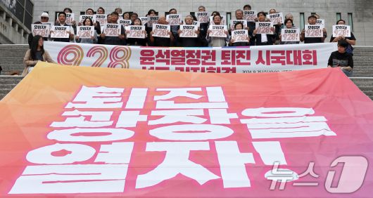 (서울=뉴스1) 이동해 기자 = 25일 오전 서울 광화문 세종문화회관 계단에서 열린 9.28 윤석열 정권 퇴진시국대회 선포 기자회견에서 참석자들이 구호를 외치고 있다. 이날 윤석열정권퇴진운동본부, 전국민중행동, 자주통일평화연대, 전국비상시국회의는 오는 28일 전국 각지에서 윤석열 정권 퇴진 대회를 개최한다고 밝혔다. 2024.9.25/뉴스1